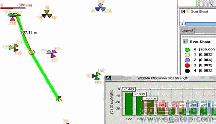 越区覆盖问题与导频污染问题是紧密联系在一起的。实际工程中,大量的导频污染是由于各小区的主服务区不清晰、信号飘散很广引起的。目前的网络分析软件大多数只提供了导频污染的分析结果,但是对越区覆盖没有明确的分析,需要靠网优人员对各小区的最佳覆盖区域进行逐个考察,进而识别越区覆盖的小区。对于规模较大的商用网络,得到满意的分析结果需要较多人工工作量。CNA支持对越区覆盖的分析,设定好分析参数后,无需任何额外人工判断,软件即可自动可视化地在地图上标示出存在越区覆盖的小区,并且用连线的方式直观显示出测试路径上每点被哪几个小区越区覆盖了。这无疑极大地提高了分析工作的效率,让工程师有更多的精力投入到优化方案的制定和实施中去。