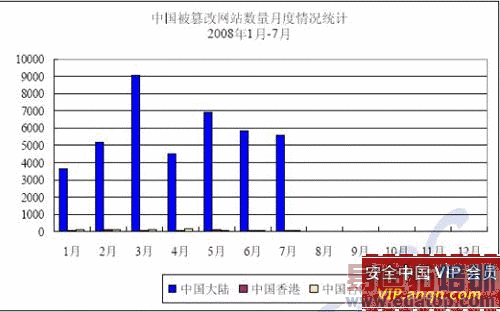 以下是国家计算机网络应急技术处理协调中心(CNCERT/CC)统计的2008年上半年我国国内网站被黑被篡改的统计图,在1月-7月内仅发现的被篡改的网站就多达41,000多个,平均每天就有近200个网站被篡改,这真是一个惊人的数字。