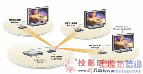 这里所强调的是通过无线以太网络收音机的无线数字分配解决方案。电脑设备将视频信号传输到无线发射器,紧接着将视频信号转换成数字数据,这些数据是被加密了的,然后经无线接收器传送到每个屏幕上。接下来,接收器会将无线数据转换成视频信号,并输出到显示器屏幕上。