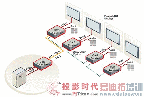 该解决方案是通过非屏蔽双绞线电缆(UTP)进线视频分布的,包括Cat5、5e、6、7等等,都属于铜电缆。电脑或媒体播放器输出VGA视频信号到UTP发射器,发射器的信号转变为电压更高的信号,并通过UTP线缆进行延长传输。一般来说,红、绿、蓝视频信号分别通过不同的UTP电缆进行传输,其余的双绞线是用于辅助信号的,如穿行或音频。在电缆的另一端,UTP接收器则负责转换接收到的VGA信号,并发送到屏幕上。