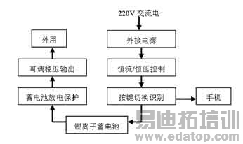 从手机锂离子二次电池的恒流/恒压充电控制出发,用220V 交流电通过配置的内置储能锂电池对手机锂离子电池充电。电路的具体工作流程如图1所示。