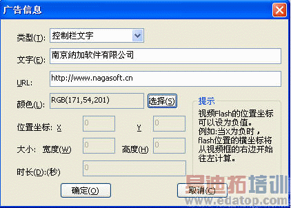 打开广告设置,新建或添加广告文件。文件类型包括控制栏文字、视频文字和视频Flash三种类型,可以随意设置文字内容,颜色,出现位置,时长以及广告次数和间隔时间。