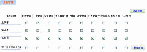可授予的权限分别有影片管理、上传管理、审查管理、角色管理、用户管理、收费管理、广告管理、资源服务器、系统设置、统计管理。默认系统管理员拥有所有权限。