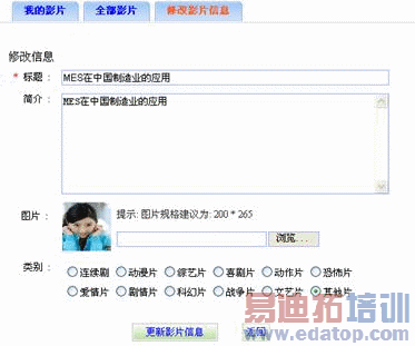 影片的信息包括:影片标题、影片简介描述信息、影片视频文件、影片相关图片和影片类别等。