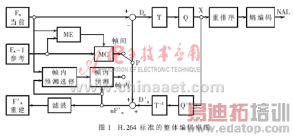 H.264标准采用分层体系结构,系统分为:视频编码层VCL(Video Coding Layer),负责高效的数字视频压缩;网络抽象层NAL(Network Abstraction Layer),负责对数据进行打包和传送。H.264编码图像通常分为三种类型:I帧、P帧、B帧。I帧为帧内编码帧,其编码不依赖于已编码的图像数据。P帧为前向预测帧,B帧为双向预测帧,编码时都需要根据参考帧进行运动估计。同时,H.264在提高图像传输容错性方面做了大量工作,重新定义了适于图像的结构划分。在编码时,图像帧各部分被划分到多个Slice结构中,每个Slice都可以被独立编码,不受其他部分影响。Slice由图像最基本的结构——宏块组成,每个宏块包含一个16×16的亮度块和两个8×8的色度块。H.264标准的整体编码框图如图1所示。编码过程中,原始数据进入编码器后,当采用帧内编码时,首先选择相应的帧内预测模式进行帧内预测,随后对实际值和预测值之间的差值进行变换、量化和嫡编码,同时编码后的码流经过反量化和反变换之后重构预测残差图像,再与预测值相加得出重构帧,得出的结果经过去块滤波器平滑后送入帧存储器。采用帧间编码时,输入的图像块首先在参考帧中进行运动估计,得到运动矢量。运动估计后的残差图像经整数变换、量化和嫡编码后与运动矢量一起送入信道传输。同时另一路码流以相同的方式重构后,经去块滤波后送入帧存储器作为下一帧编码的参考图像。