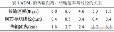 ADSL系统的传输信号的最长距离因线径的粗细、信号传输速率的高低而有所不同。其对应关系如下表1所示。