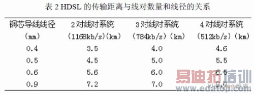 HDSL系统常采用的线路码型有两种:2B1Q码和CAP码。2B1Q是无冗余的四电平脉冲码,属基带传输码,即用1位四进(quaternary)码组表示2位二进制(Binary)码组。CAP(Carrierless Amplitude/Phase modulation)码是无载波调幅调相技术,有冗余调码,属带通型传输码。在HDSL系统中,CAP码常和时间压缩调制TCM(Time Compression Modulation)结合使用。CAP的功率频谱滤除了低频和高频部分,克服2BIQ的缺点,因而传输距离远,误码率低,抗干扰能力强,对外界干扰小。由于CAP码带宽较2BIQ减小一半,使传输速率提高一倍。采用CAP码的HDSL系统在两对双绞线上传输时,其传输性能优于2B1Q 编码的HDSL系统传输性能。由于历史原因,早期HDSL系统采用2B1Q码,因而已经在市场上占有一席之地。例如百灵(PairGain)、RAD、台联(Tainet)、AT&T等很多厂家都提供采用2B1Q编码的HDSL系统。而CAP编码技术出现得晚一些,加之技术较为复杂,成本相应略高,但相同传输速度情况下,采用CAP编码的HDSL比采用2B1Q编码的HDSL传输距离长40%左右,所以,CAP编码将成为的HDSL的主流。HDSL支持的最大传输距离与其系统的线径及线对数量有关,如下表2所示: