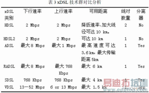 除了上面提到的ADSL和HDSL技术以外,xDSL技术群还包括RADSL(速率自适应非对称数字用户环路)、SDSL(单线数字用户环路)、VDSL(宽带接入技术)。下面对xDSL技术群做一个总结,其结果如下表3所示。
