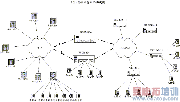 PSTN语音网络和INTERNET网络以及以图象为特征的广播电视网络三网融合将是必然的趋势,这其中的两大网络PSTN和INTERNET网已经在某种程度上出现融合,诸如网上语音聊天、IP电话等,共同点即是通过IP数据包承载着模拟语音信号,实现模拟语音的数据通道传输,由于模拟语音信号在传统的PSTN网络中占用64kbps带宽,经过数字压缩技术处理后的语音信号带宽已经大大减少,因此大大节省了呼叫发起者的通话费用。自从INTERNET进入商业领域并不断的发展,尤其是计算机的广泛应用和普及以及WEB技术的使用,数据业务呈现爆炸似的增长,上网几乎成为一种"虚拟生活方式";从技术上看,传统的电信网已经不能够满足通信业务进一步发展需求,语音业务由PSTN网络来承载,ATM业务由ATM网络来承载,对于运营商而言,无论是基础网络建设还是设备的维护运行成本都是十分巨大的,而IP技术使多网融合成为可能,另外IP技术的开放性,各种应用都可以架构在IP技术之上。IP技术+电信级运营要求构成的IP电信网将是下一个发展方向。下面以SXBCTV硬件平台(包括PSTN网络和INTERNET网络)为基础说明IP语音系统的前景应用以及远景规划。组网图大致如下: