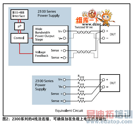 为了保持对被测设备提供精确的电压。采用四线法。即两线输出电压。另外两端直接测量被测设备电压。通过测试负载上的电压能补偿电源到DUT之间因引线电阻引起的电压降。而且,此类电源采用宽带电压输出,从而获得较小的电压降和较快的恢复时间。