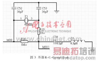 时钟系统视为带有适用低电平的MPLL_BP 和 UPLL_BP 引脚的内部PLL模式设计。主时钟由芯片振荡器和PLL产生。MCLK频率是96MHz。在这种情况下,MXI和MXO之间需要一个外部R-C-Crystal tank,如图3所示。