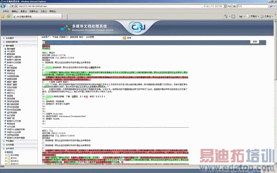 该系统界面左边是所有的新闻信息源入口,包括美联、路透、福克斯、新华社、全台通告库、内部各个部门以及外部记者经外部接口回传的素材等多种素材的"新闻素材池"。这个素材池以多语种、多媒体的方式展现在用户面前,每30秒(可设置)就会刷新一次,在用户看来只是统一格式的多媒体文档的集合,实际上平台背后有多个自动管理系统对不同格式素材接收机进行分别处理和格式过滤,然后经协调调度后统一进入平台媒资才得以实现的。用户根据权限的不同,可以将新闻素材池中所需要的内容"提取"到本部门,然后进入编辑、修改、审核、发布等多个新闻制作环节。值得注意的是,不同用户的修改信息都会留下修改痕迹,以供后续校验。如图2.7所示: