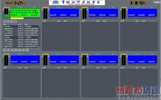 高码流视频系统采集主要用于为播出级电视成品制作过程所用,采集控制端界面所见即所得,可以同时控制多台收录服务器,如图2.12所示,纵向排列的每个通道表示一个正被管理的采集服务器,在控制端上可制定收录计划以实现远程控制收录。收录后的内容会自动再生成一路低码流视频和一路S48伴音,低码流素材供平台内部检索预览使用,而伴音素材则可以直接用来进行音频制作。三路素材形成一个关联素材包并进入媒资以供编目和后续调度使用。