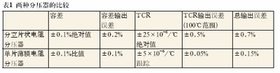 通过选择单片衬底上的高精度薄膜分压器,设计人员可以确保分压器中的电阻元件具有非常相似的电气特性,并在温度和时间变化时实现很好的跟踪。在公用衬底上的材料和处理过程的相似性确保了分压器能够在所有比值和环境下更为稳定,且性能更好。