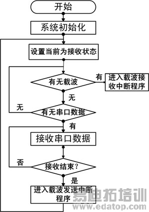 当系统启动时,程序完成初始化后便自动进入从电力线接收数据的状态,开始检测载波信号的有无及正确与否。如果检测到载波信号且正确,则系统进入载波接收中断程序,开始接收从电力线上传来的数据;如果一开始没有载波信号,则系统开始检测串口,判断串口是否有数据传送过来,若目前有串口数据则系统进入串口数据接收状态,确定串口数据接收完成后就马上进入载波发送中断程序,完成数据调制并发送。如果电力线及串口都无数据传送发生,则系统重新进入检测状态,重新开始检测电力线,进入新一轮循环。流程图如图4所示。为了避免串口同时处于接收与发送状态,造成数据冲突,程序中是以状态字的查询以及中断的设置来完成。