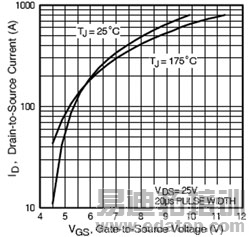 在MOSFET的数据表中,通常可以找到它的典型的传输特性。注意到25℃和175℃两条曲线有一个交点,此交点对应着相应的VGS电压和ID电流值。若称这个交点的VGS为转折电压,可以看到:在VGS转折电压的左下部分曲线,VGS电压一定时,温度越高,所流过的电流越大,温度和电流形成正反馈,即MOSFET的RDS(ON)为负温度系数,可以将这个区域称为RDS(ON)的负温度系数区域。