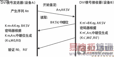 HDCP具体工作过程:首先由主机发送密钥选择导引序列(AKSV)和64bit伪随机序列(An)到接收方,接收方回传密钥选择导引序列(BKSV)和转发器位(REPEAT-bit)(如是转发器用以表示身份),发送方确认BKSV是否已被废除和是否包含20个1和20个0;如果双方的设备密钥和KSV有效,则计算产生一个56bit的公共密钥Km和Km`,然后可产生KS、KS`(传输密钥)、M0、MO`(64bit后续验证用追加初始序列)、RO、R0`(16bit指示验证成功,它必须在AKSV发送后100ms内传回发送方;验证成功后R01和R0相等;每128帧修正一次,每2s回传一次)。因此当DVI接口中断传输2s以上,或是非授权设备接收时,主机将停止传输内容,以达到保护传输内容的目的。