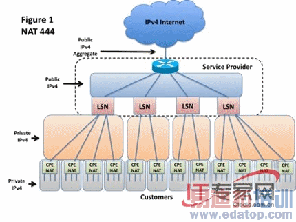 这一架构是一个NAT444架构:它将IPv4地址转换成另一个IPv4地址,再转换成第三个IPv4地址。这个方法之所以吸引人是因为可以在不更改现有CPE NAT的情况下,对其进行利用。而NAT不在乎其外部IPv4地址是公共的还是私有的,因此,对于CPE NAT而言,一切没什么不同。服务供应商部署该架构的时候,不需要对客户的设备提出特殊要求,也不需要更改其设备,任何传统NAT都可以使用。