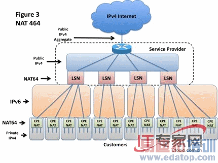 还有一种方法可以解决这些问题。使用LSN和CPE NAT之间的公共IPv6地址,如图三所示。源于客户网络的IPv4数据包会被转换成IPv6数据包,以完成CPE NAT到LSN之间的交接,然后再被LSN转换回IPv4数据包。这一架构就是NAT464架构。