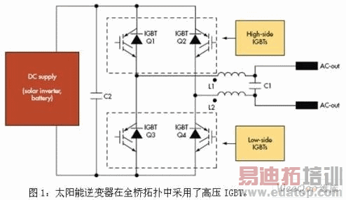 由于电源逆变器一般采用全桥拓扑,因此这个太阳能逆变器设计采用了4个高压IGBT(图1)。晶体管Q1和Q2用作高压端IGBT,Q3和Q4用作低压端功率器件。为保持低的总功率损耗低和高的电源转换效率,这个DC/DC逆变器解决方案利用低压端和高压端IGBT产生频率为60Hz的单相交流纯正弦波形。本文作者编写的另外一篇文章还介绍了如何为这种太阳能逆变器应用正确选用高压IGBT。