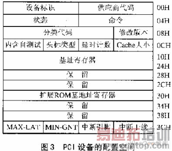 PCI设备有3种物理空间:配置空间、存储器空间和I/O空间。配置空间是长度为256字节的一段连接空间,空间的定义如图3所示。在配置空间中只读空间有设备标识、供给商代码、修改版本、分类代码连同头标类型。其中供给商代码用来标识设备供给商的代码;设备标识用来标识某一特别的设备;修改版本标识设备的版本号;分类代码用来标识设备的种类;头标类型用来标识头类型连同是否为多功能设备。除供给商代码之外,其他字段的值由供给商分配。