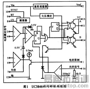 UC3846采用标准双列直插式16引脚(DIP—16)封装。其内部结构框图如图l所示。