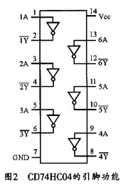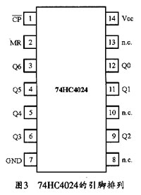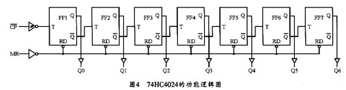 反相器CD74HC04的引脚及功能图如图2所示。脉冲计数器74Hc4024的引脚排列如图3所示。图4所示是其功能逻辑结构图。