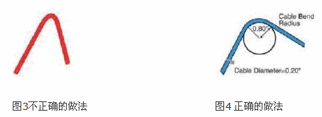 避免电缆过度弯曲。因为这可能导致线对散开,引起阻抗不匹配及不可接受的回波损耗性能。另外,弯曲过度还会影响电缆中的线对绞距,电缆内部4个线对绞距的改变将导致噪声抑制问题。一般情况下,电缆制造商都建议,安装后的电缆弯曲半径不得低于电缆直径的8倍。对典型的六类电缆,弯曲半径应大于50mm。