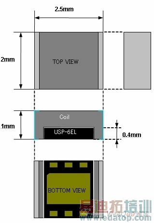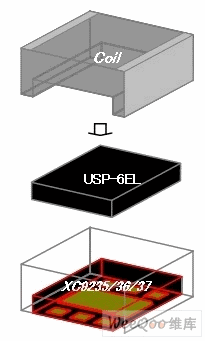 为简化生产,XCL205/206/207系列在把DC/DC转换器与线圈制作成一体时,采用了在线圈的中央部位形成凹槽,把XC9235/XC9236/XC9237系列产品嵌入凹槽,然后粘结固定的简单结构,从而解决了由于复杂工程带来的成本上升问题。此外,采用该结构,可以把线圈上方的电极和IC引脚各自直接安装到PCB上,在PCB的布局上实施DC/DC转换器的布线,同时为了把线圈和DC/DC转换器的总高度控制在1mm以内,DC/DC转换器采用了新开发的USP-6EL封装技术,高度只有0.4mm,整个XCL205/206/207的外形尺寸只有2.5mm×2.0mm,h=1.0mm,为世界最小等级的产品(图3)。