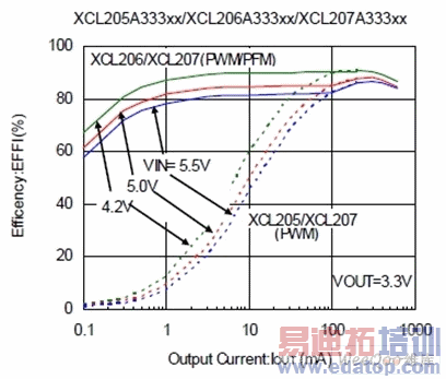 XCL205/206/207采用内置开关管同步整流方式,最大负载电流可达600mA,工作电压为2.0V~6.0V,输出电压固定以0.05V为间隔,可在0.8V~4.0V的范围内选择,开关频率3MHz,工作模式有PWM控制(XCL205)、PWM/PFM自动切换控制(XCL206)、手动切换控制方式(XCL207)3种类型可供选择,实现了从轻负载到重负载整个负载范围内快速响应、低纹波和高效率的特性(图4),而且在待机时内部电路停止工作,消耗电流可控制在1.0uA以下。