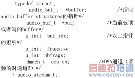 在Write方法中首先判断设备文件打开的方式,具有write特性打开的设备才可以写入,然后判断是否没有建立DMA缓冲区,若没有,则通过audio_setup_buf()来创建,定义一个结构体(audio_stream_t)的指针如下: