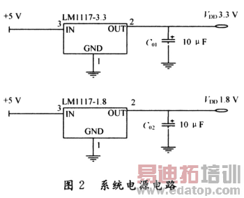 LPC2124的内核及片内外设供电电压为1.8 V,I/O口所需电压为3.3 V,而整个数字电路的供电电源为5 V,且通过78M05将电源5 V稳压,故选用了LDO芯片LM1117MPX-3.3和LM1117MPX-1.8稳压输出3.3 V及1.8 V电压,其电路如图2所示。