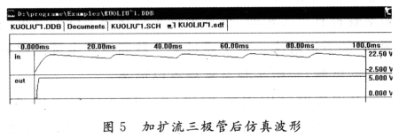 为了增大电源的带负载能力,在原电路的基础上加扩展电流三极管Q1后,带同样的负载,输出电压很稳定(5 V),仿真波形如图5所示。