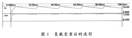 用Protell 99 Advanced SIM 99对图1所示电路进行仿真,发现当负载变重,超过78M05最大输出电流(0.7 A)时,将使输出电压的纹波增大,输出电压(out)下降且不稳定,out波形有明显的波动,5 V下降为4 V左右,且输出(out)波形不平滑,纹波大。负载变重后的仿真波形如图4所示。