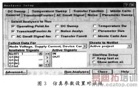 首先进行仿真参数设置,进行瞬态分析与傅里叶分析,仿真参数设置对话框如图3所示。