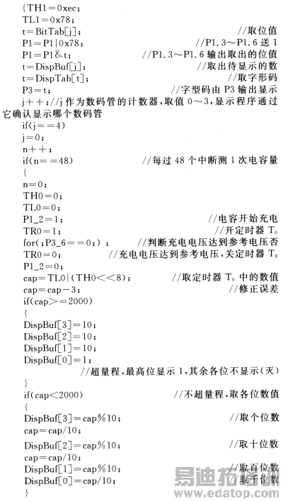 该设计用AT89C2051单片机集成电路,X1用12 MHz的石英晶体,S1选用1×4的波段开关,DS1~DS4选用共阴LED数码管。安装前先将C语言源程序用KEIL 51编译成目标文件即HEX文件,再用编程器将HEX文件写入AT89C2051芯片。调试工作主要是通过对RP1的调节来调整基准电压,最好是通过对一个精度比较高的的电容器的测量来进行调节,而不是直接测量基准电压。具体方法是,选一个经确认容量比较准确的电容器,如15 nF的电容器,将S1置于20 nF档上,调节RP1是测量显示值为1 500。选择的电容器容量至少要大于相应量程的50%,最好是接近满量程,才能调得比较准确。该档调试好后其他各档也就调试好了。如果发现某档精度有问题,可改变其相应充电电阻的阻值来进行调整。在使用过程中,当S1置于2 nF档时,在没有接人测试电容器时,有10 pF左右的显示值是正常的,因为这是电压比较器的输入电容和电路的分布电容。