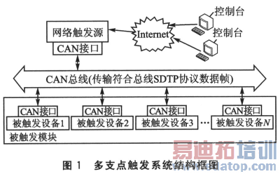 多支点触发系统包括以下几个模块:控制台模块、网络触发源模块、被触发设备模块。其中,网络触发源和被触发设备都是挂载在总线上的,通过现场总线可以将系统各个节点相互连接起来以方便管理。嵌入式web就是应用于网络触发源模块中,它负责控制台和被触发设备之间的通信。控制台通过浏览器访问网络触发源,在Web页面上完成相应控制操作后,由网络触发源把操作命令发送到总线上,被触发设备从总线上接收到命令后,完成相应操作。在网络触发源模块中,Web服务器采用的是Boa,嵌入式操作系统采用的是uClinux,处理器采用的是Sam-sung公司的S3C44BO。多支点触发系统结构如图1所示。
