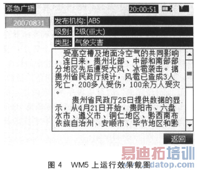 当新接收的紧急广播消息中有紧急程度为1级或者2级的紧急广播时,直接弹出图4所示的界面。新接收的紧急广播消息紧急程度都是3级或者4级时,仅需要给用户1个闪烁提示,由用户选择是否观看紧急程度不太高的广播消息。b.如果是EBP_RECEIVE_TIMEOUT消息,本客户端采用的策略是首先调用ebp_cancel_receive接口,对此次接收失败的环境进行清理,然后过10分钟再次进入步骤②。