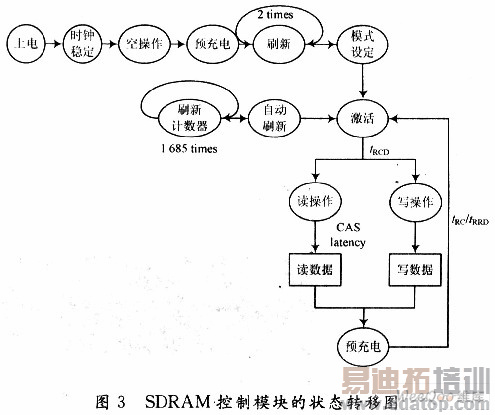 状态机是SDRAM控制器的核心控制模块,其作用主要有两个方面:其一是对各模块发出的操作请求进行仲裁,在适当的时刻作出反映,发出对SDRAM适当的控制命令;其二是协调各模块之间的时序关系,满足对SDRAM读写所必需的时序要求。状态机的状态转移如图3所示。