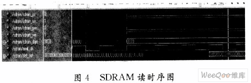 该设计目的是为了扩展TMS320DM642的FIFO容量,以FPGA为接口,实现与SDRAM的连接。TMS320DM642可以对4 GB的地址进行寻址,而实际应用中FIFO的容量只有256 KB,寻址空间为0x0184000~0x0187FFFF,因此在实际应用中必须进行扩展。这里采用1片MICRON公司的MT48LC4M3282型号的128 Mb SDRAM,采用32位数据总线,将其通过FPGA配置在TMS320DM642处理器的EMIFA CE3上,其地址范围为0xB0000000~0xB7FFFFFF。在该设计中,突发长度为8,CAS latency为3。图4为用Modelsim SE 6.0仿真的SDRAM读时序图。
