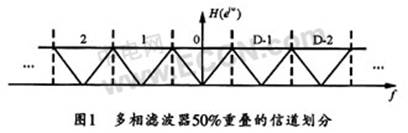 复信号多相滤波器的作用是用D个信道将-fs/2~fs/2频段均匀划分,然后用输入信号S(n)以复本振信号,再将特定频段的信号搬移到基带,并通过低通滤波器得到位于该信道的信号,然后进行抽取,以降低数据速率。无盲区的信道划分如图1所示。由于其相邻信道有50%的重叠,因此,相邻信道间不存在盲区,故能对信号进行全概率捕获。