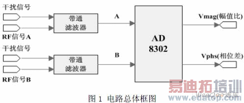 本文选择的滤波器是BESSEL 带通滤波器,具有最窄过渡带;在通带内时延均衡,电路 所用的阶数最少;在实际的应用中电路容易调整;由于所有的节点谐振在相同的频率上,调 谐比较简单;从经济性和制造容易程度来考虑,电容耦合电路最合适,而用Bessel 函数设 计的滤波器正是电容耦合电路,故采用Bessel 函数进行滤波器的设计。再利用美国ADI 公 司推出的AD8302 RF/IF 幅相检测芯片来对滤波后的信号进行幅相检测,以达到满足设计精 度的要求。方案设计框图如图1: