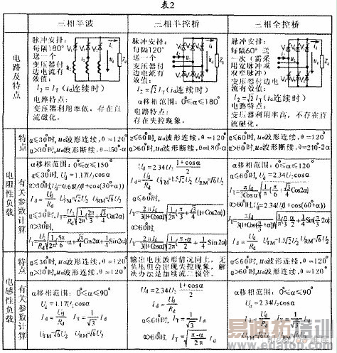 从表1中可见,对于单相整流电路当晶闸管的控制角α>0°时,ud的波形就不连续,只有单相全控桥电感性负载,α>90°时,ud的波形不连续。同样从表2可见,对于三相整流电路,三相半波电路是以α=30°。作为输出电压波形连续与否的分界点;而三相桥式整流电路(包括半控桥和全控桥)均是以α=60°作为输出电压波形连续与否的分界点。