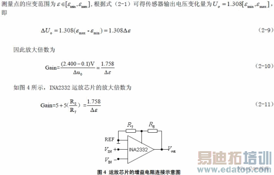确定了R7 的值后,即可根据式(2-10)计算R8 的值,然后从标称系列选择最接近该阻值的电阻。此 处选R = 5.1KΩ 7 ,根据连杆上的应变,可选R = 360KΩ 8。