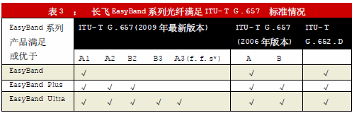 长飞针对本次ITU-TG.657标准建议的修订,长飞公司EasyBand系列光纤产品与ITU-T最新标准建议中产品分类的对应关系如表3所示。
