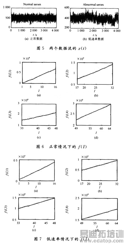 图5表示两个数据流的x(t),图6,图7表示两种情况下的,f(I,n)(n,I=1,2,…,16)。由于版面限制,只给出前四种情况。图8,图9是两种情况下的平均速率图和速率的概率密度分布图,由此可以清楚地看到,此种方法能准确地分辨出低速率和正常的速率,能够用于低速率攻击的检测。
