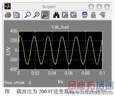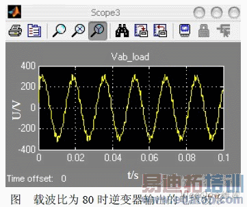 在Matlab/Simulink 下搭建仿真模型进行仿真。改变逆变器的载波频率,观测电压波形。 分别设定载波比为80,128, 200,即IGBT 的开关频率为4000Hz,6400Hz, 10000Hz(IGBT 的最大开关频率为20000Hz),依次记录逆变器的输出电压波形。