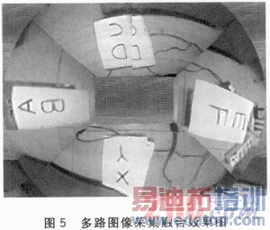 为检验高速多路视频数据采集系统的图像采集效果,系统外接4路摄像头同时采集图像数据,在实际视频数据采集过程中,多路视频图像显示连贯流畅。将存储在SDRAM中的图像数据读取后,通过后期融合算法,融合成环境平面图像,实际多路图像采集融合效果如图5所示。