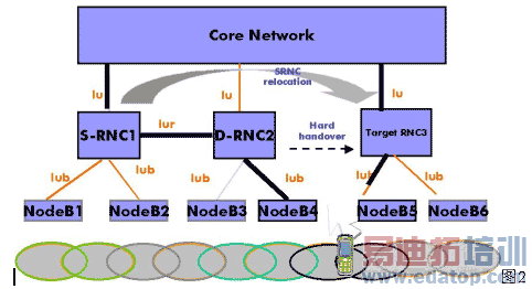 方式3 RNC之间不完全Iur连接(partial Iur Mesh ),这种情况常发生在传输资源受限的地区。此时采用硬切换保证通话的连续。如图2,DRNC与Target RNC3之间没有Iur接口,当手机用户处于Node B4 和Node B5之间时,SRNC将命令手机进行邻小区无线信号的测量,此时由于无法进行Iur的软切换信令控制,SRNC将启动重定位,由核心网交换机进行同频硬切换,保证通话的连续。同时,硬切换还可能发生在不同交换机之间(跨省边界)。上海贝尔阿尔卡特的设备支持同频硬切换功能,足以保证通话顺畅。