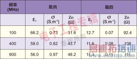 表1:人体介电常数(εr)、传导率(σ)和特性阻抗(Zo)与频率的关系
